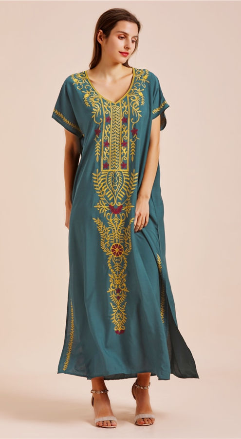 2023 Embroidery V-Neck Short Sleeve Summer Beach Dress Plus Size Tunic Women Kaftans Batwing Sleeve Long Dress Beachwear Q790
