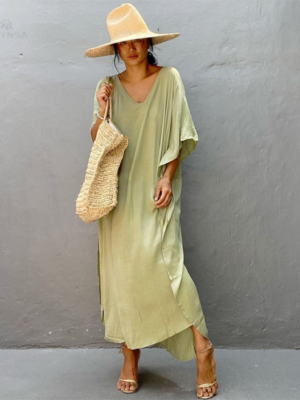 2023 Solid Long Kaftan Casual V-Neck Robe Summer Batwing Sleeve Woman Clothing Side Split Beachwear Maxi Dress Q1384