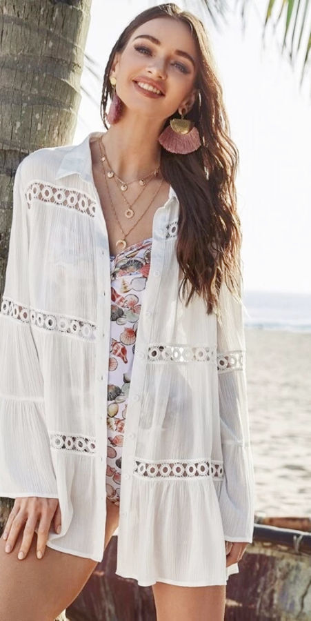 2023 Women Shirt Beach Dress Mandarin Sleeve Kaftan Beach Tunic Dress Robe De Plage Solid White Pareo Beach Blouses Q429