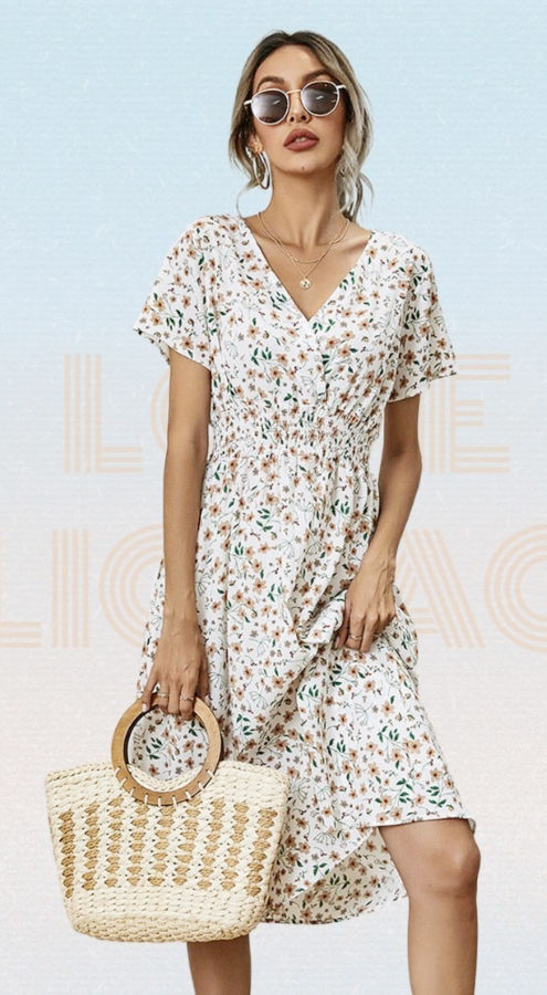 Allover Floral Print Shirred Waist Flared Hem Dress Summer Women Holiday Short Sleeve V-Neck A-Line Long Dress Robe Femme