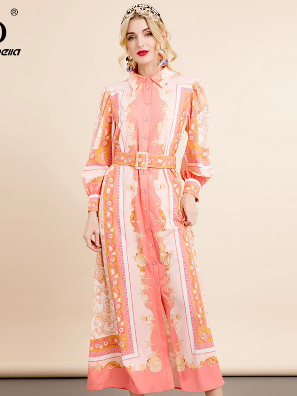 Autumn Runway Vintage Gown Dress Women’s Fashion Lantern Sleeve Loose Printed Long Party Dress