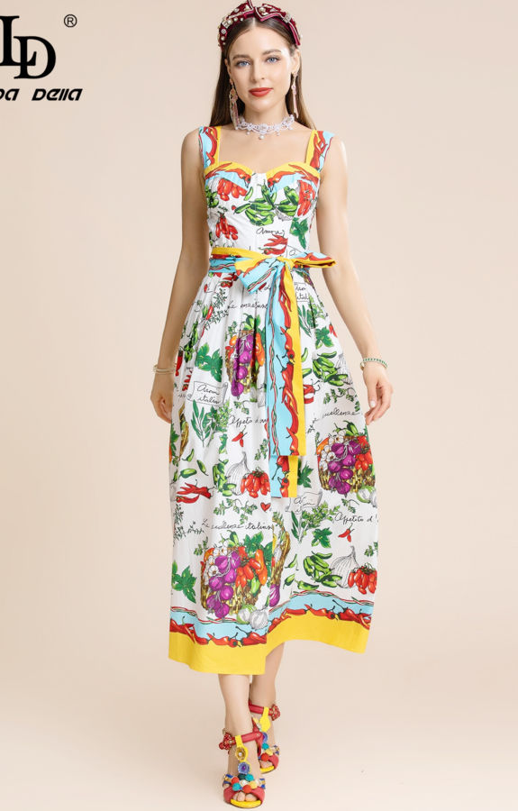 Autumn Vacation Cotton Dress Women Spaghetti Strap Vegetable And Fruit Letter Print Vintage Party Long Dress