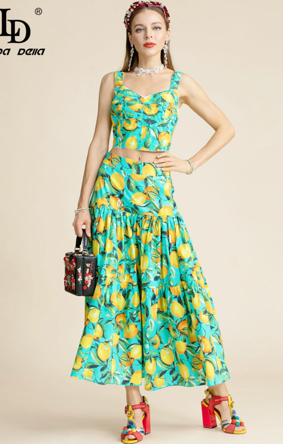 Designer Summer Cotton Vacation Skirts Suit Women Short Spaghetti Strap Top And Lemon Print Skirts 2 Pieces Set