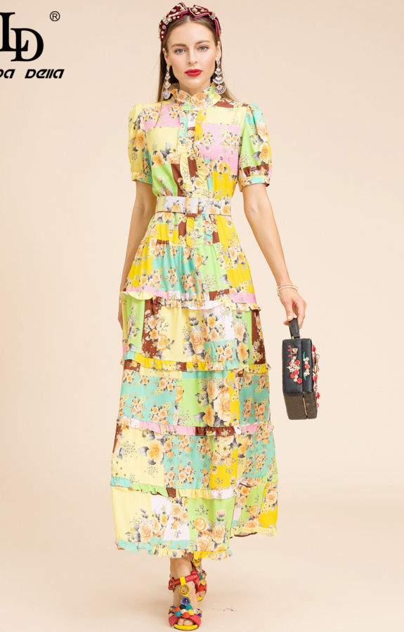 Designer Summer Fashion Dress Women’s Puff Sleeve Sashes Flower Print Vacation Party Vintage Long Dresses