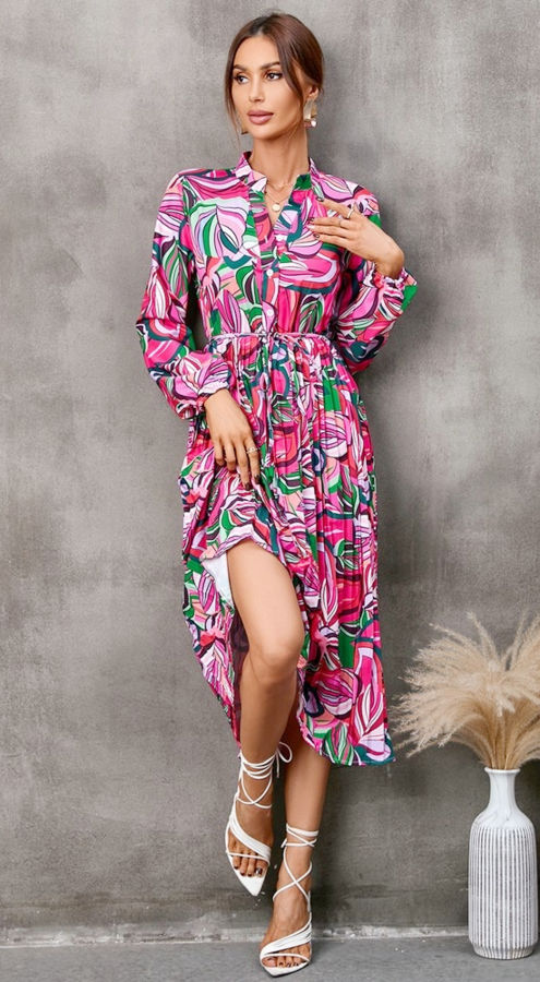 Dress Women Half Button Pleated Hem Belted Dress Leaf Print Long Stand Collar Sleeve Autumn Dress Women Casual Long Dress