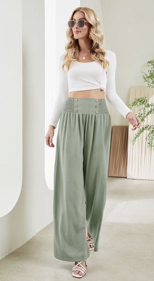 Elastic Waist Wide Leg Pants Womens Fashion Solid All Season Loose High Waist Shirring Casual Trousers Women Pantalon Femme