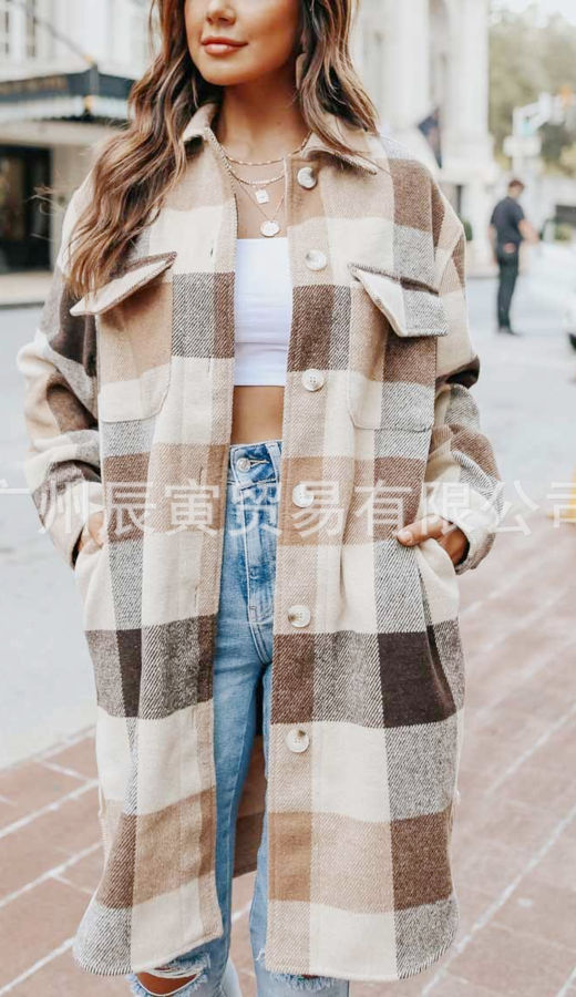 Fall Street Lapel Loose Women’s Plaid Wool Coat Medium Long Coat