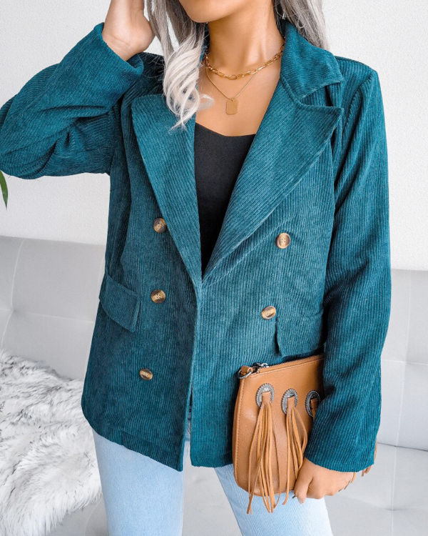 Fashion Office Ladies Notched Collar Women Blazer Double Breasted Autumn Denim Jacket Casual Pockets Female Suits Coat