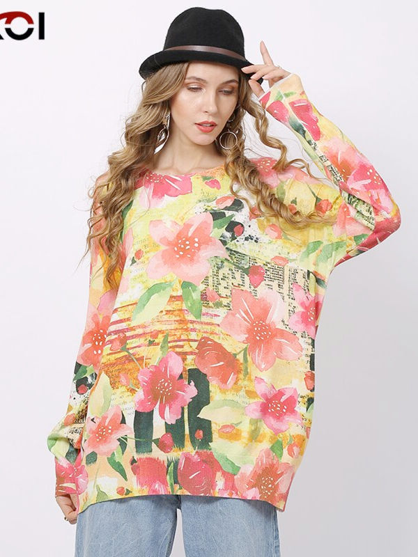 Fashion Pink Flowers Print Sweater Tops For Women Long Sweater Pullovers Casual Knitted Sweater De Invierno Mujer
