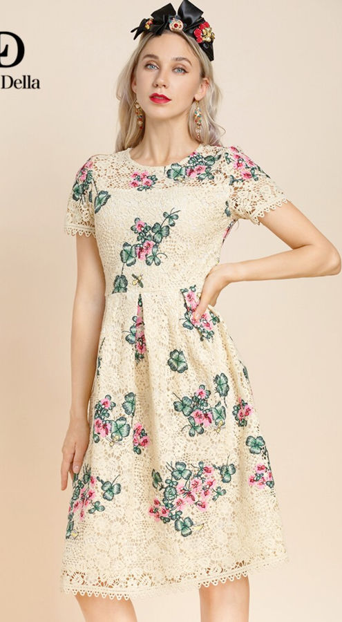 Fashion Runway Designer Summer Dress Women Short Sleeve Vintage Flower Embroidery High Waist Midi Party Dress