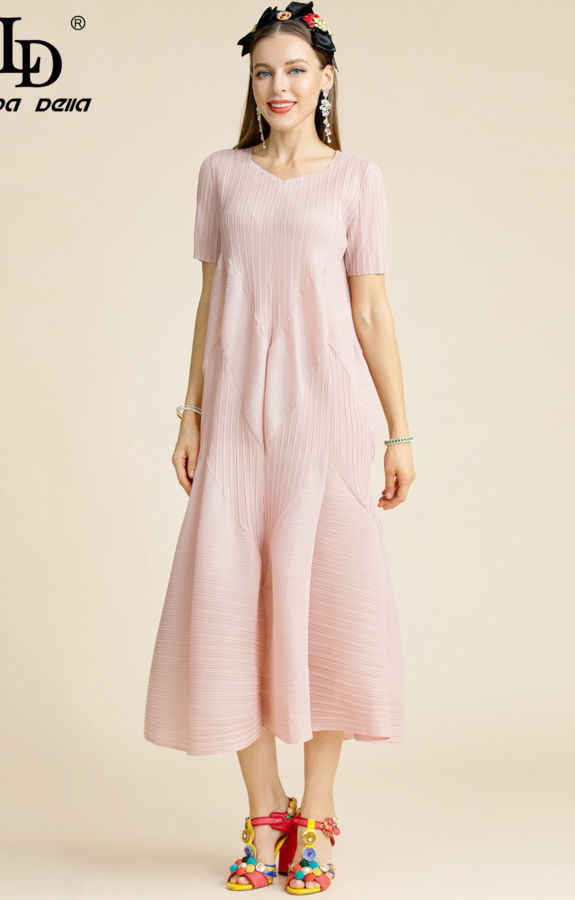 Fashion Runway Designer Summer Dress Women’s Short Sleeve Elasticity Pink Loose Midi Dresses Vestidos