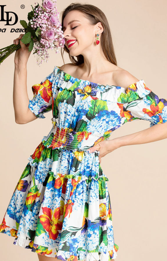 Fashion Runway Summer Cotton Short Dress Women’s Slash Neck Elastic Waist Floral Print Vacation Mini Dress