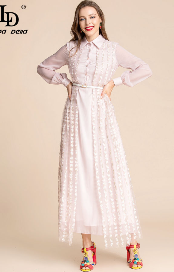 Fashion Runway Summer Dress Women Turn-Down Collar Single-Breasted Sashes Mesh Embroidery Long Party Dress