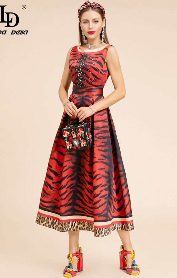 Fashion Runway Summer Midi Women’s Sleeveless Tiger Skin Leopard Print Vintage Club Party Dress Vestidos