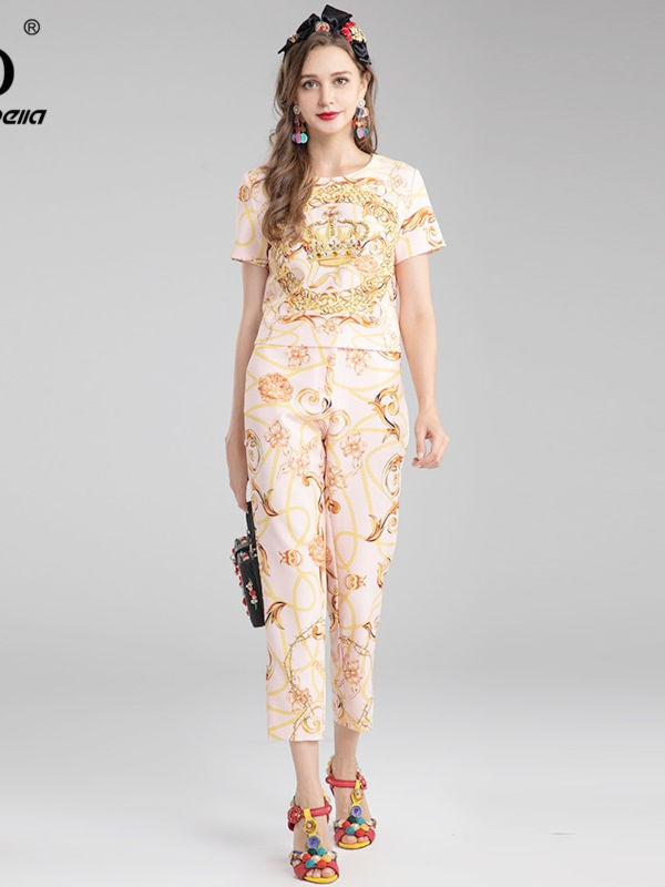 Fashion Runway Summer Pants Suit Women’s Beading Short Sleeve Top And Flower Print Slim Pants Two Pieces Set