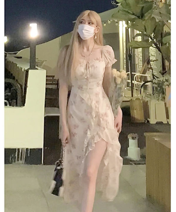 Floral Suspender Dress Summer Women’s Irregular Ruffle Hem Split Long Skirt Niche Design