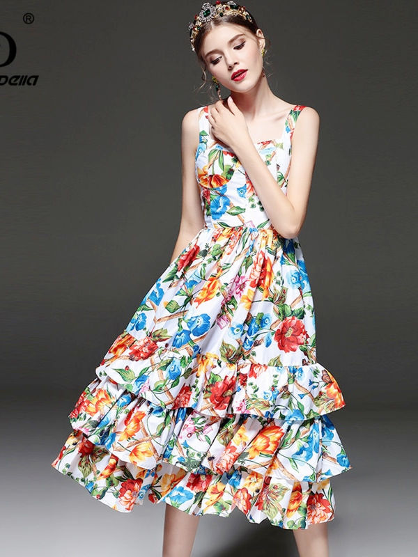 High Quality Runway Summer Dress Women’s Spaghetti Strap Tiered Ruffle Casual Floral Printed Dress