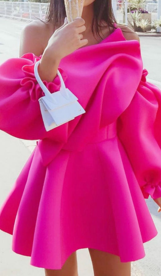Irregular Neck Mini Dresses Puff Sleeve Women Summer Solid Color Office Ruffle Casual Dresses Mujer Vestido Luxury
