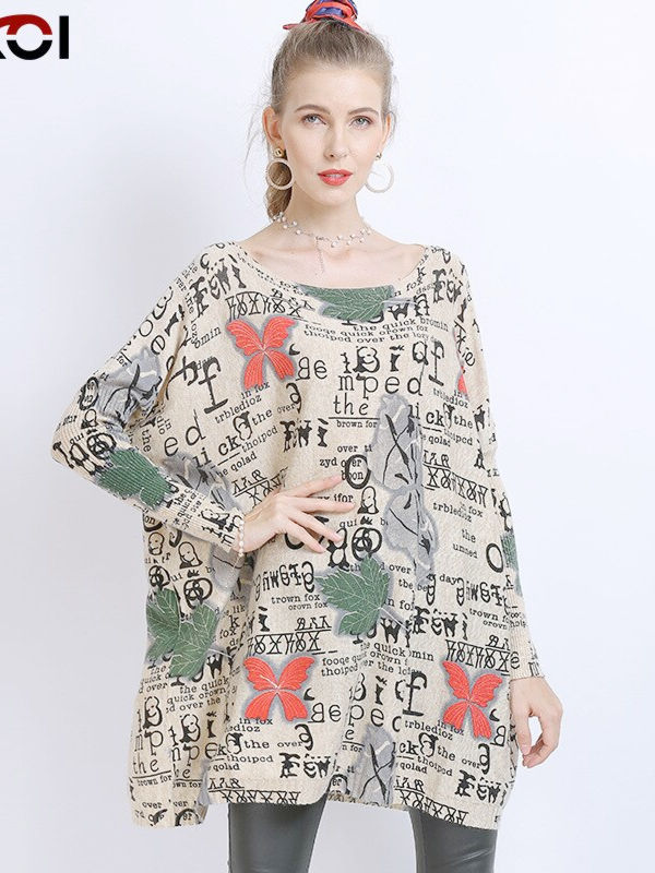 Letter Print Knitwear Women O-Neck Pullovers Batwing Sleeve Casual Long Sweaters Dress Women Sweaters And Pullver