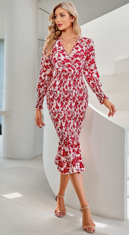 Luxury Floral Flounced Draped Bodycon Dress Woman V-Neck Petal Sleeve Mid-Calf Slim Dress Autumn Robe Femme Party Dress