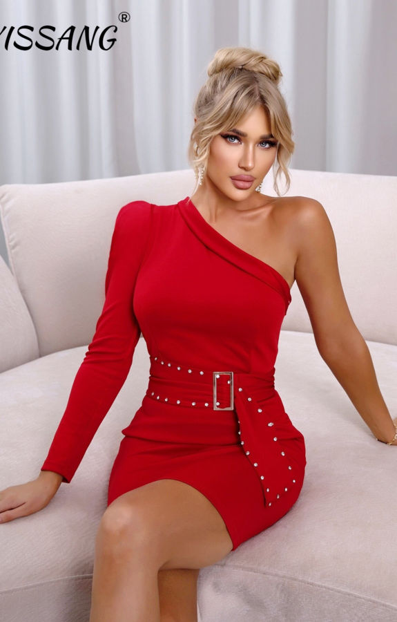 One Shoulder Rhinestone Belted Dress