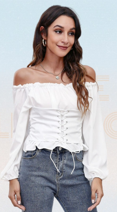 Plain Front Criss-Cross Back Elastic Slim Waist Chiffon Tops Women Lantern Sleeve Off Shoulder Shirts Autumn Fashion Short Tees