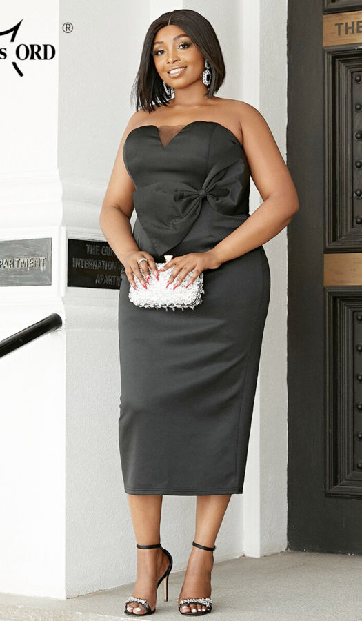 Plus Size Big Bow Contrast Mesh Tube Midi Dress Women Large Evening Party Off Shoulder Bodycon Dress Sleeveless Black