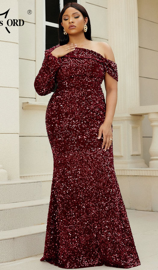 Plus Size One Shoulder Sequin Dress Fashion Elegant Evening Dress Plus Contrast Sequin Asymmetrical Neck Dress Vestidos