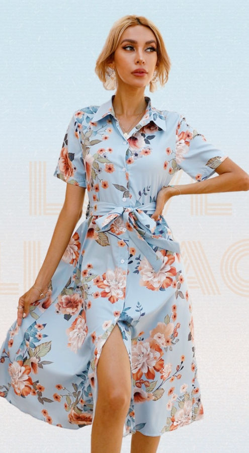 Print Turn-Down Collar Short Sleeved Long Dress Summer Womens Lace-Up Single Breasted A-Line Casual Dress Chiffon Dress