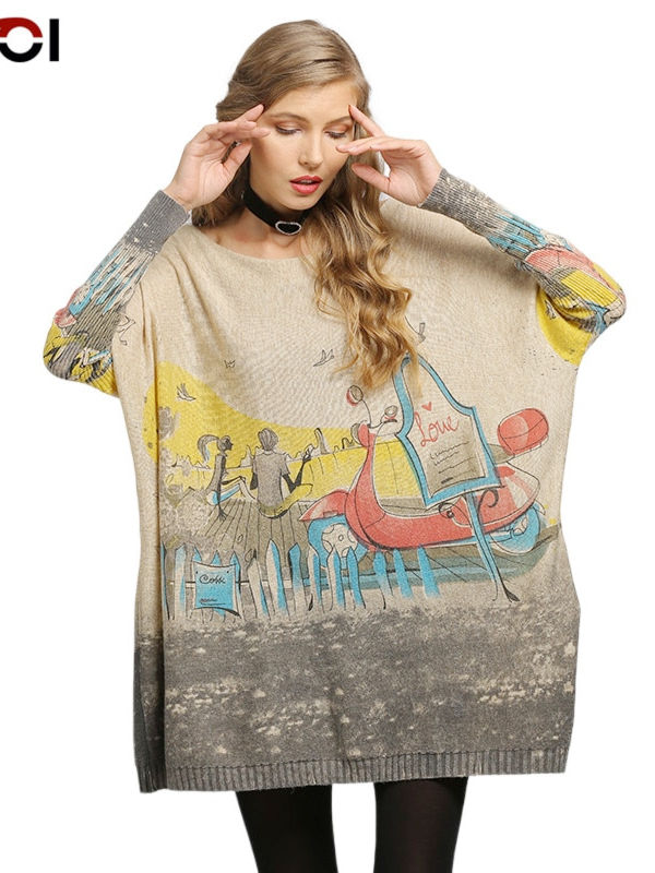 Romantic Love Story Print Knitted Sweater Women Oversized Pullover Autumn Pull Femme Long Sweater Dress Batwing Sleeve