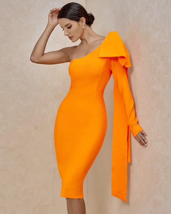Runway Bownot One Sleeve Women One Shoulder Bodycon Orange Club Party Dress