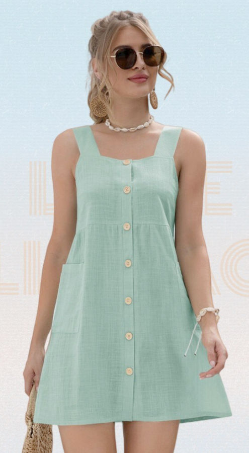 Solid Square Neck Single Breasted Pockets Sleeveless Camisole Dress Women Summer Sweet Loose Waist A-Line Ladies Dresses Robe