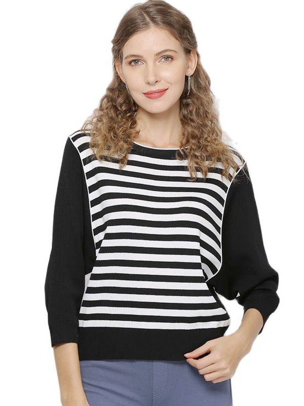 Spring Women Stripe Short Sweaters O-Neck Bat Sleeves Tops Fashion Korean Style Oversized Knitted Pullover Loose Jumper