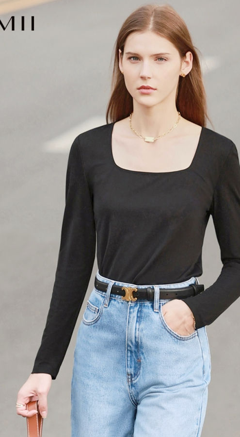 Spring Women’s Tops Square Collar Retro Knitted T-Shirt Solid Slim Long-Sleeved Female Top Office Lady 12230090