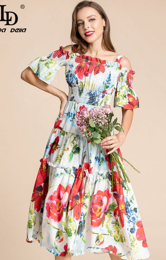 Summer Cotton Dress Women’s Spaghetti Strap Elastic Waist Floral Print Elegant Holiday Dress