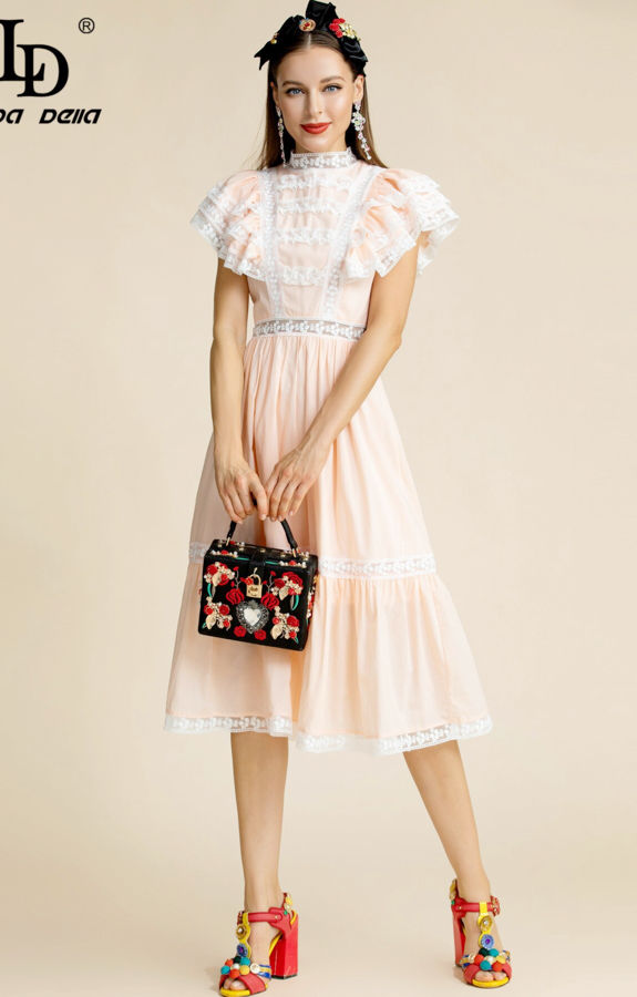 Summer Dress Butterfly Sleeve Ruffles Lace Flower Embroidery Pink Elegant Party Midi Dress