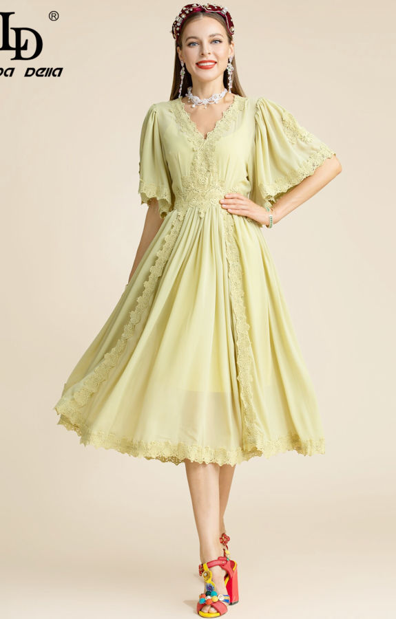 Summer Dress Women V-Neck Flare Sleeve Embroidered High Waist Solid Color Midi Dresses Vestidos