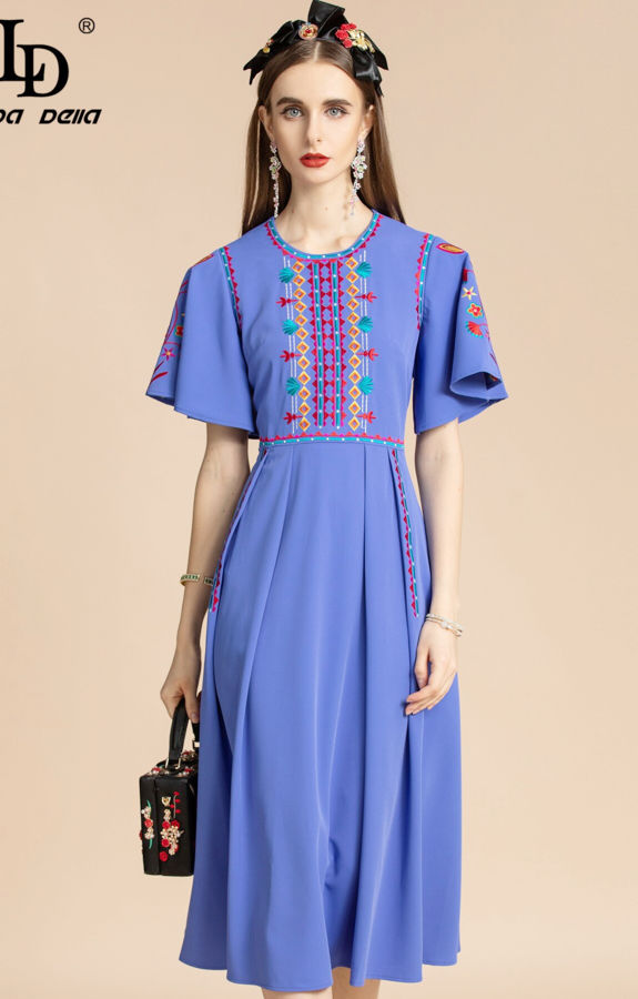 Summer Dress Women’s Flare Sleeve High Waist Flower Embroidery Solid Vintage Party Dresses