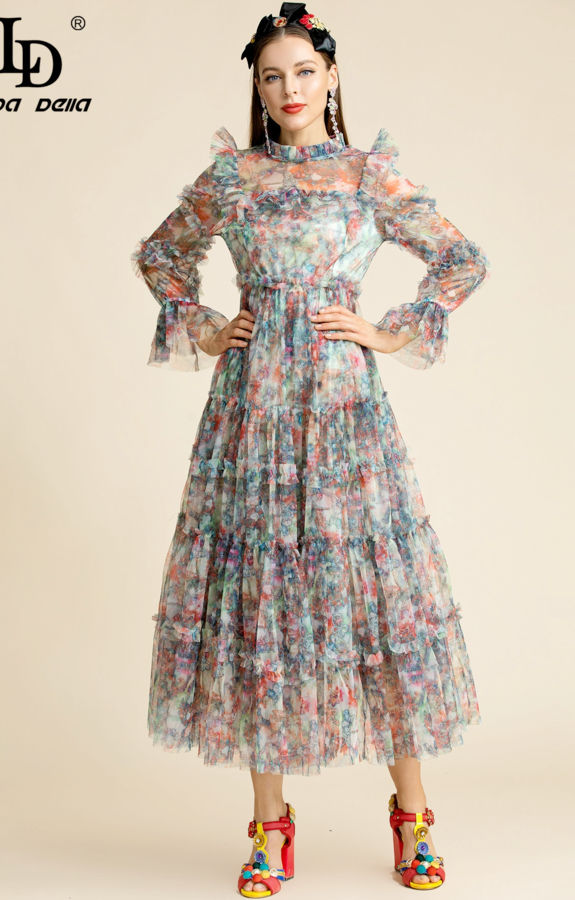 Summer Dress Women’s Stand Collar Floral Print Ruffles Mesh Vintage Long Dresses Vestidos