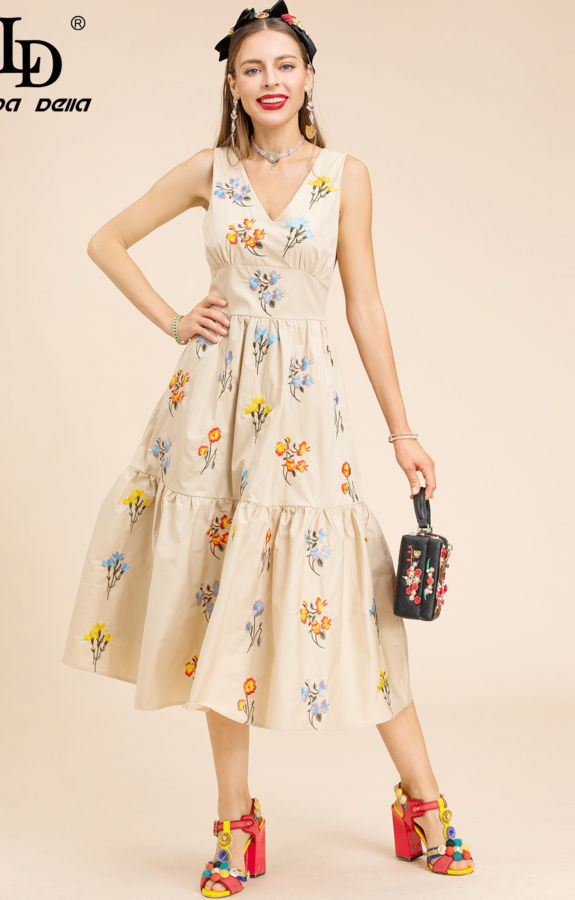 Summer Dress Women’s V Neck High Waist Flower Embroidery Vintage Party Midi Dresses