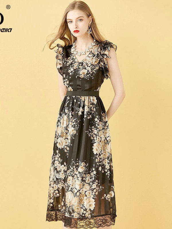 Summer Fashion Runway Dress Women Vintage Chiffon Butterfly Sleeve Lace Patchwork Floral Print Female Midi Dress