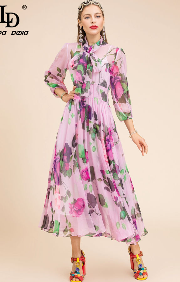 Summer Fashion Runway Vacation Dress Women’s Lantern Sleeve Floral Print Chiffon A-Line Midi Dress Vestido