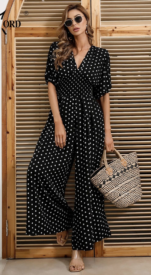 Summer Jumpsuit Women Elegant ?Rompers V Neck Dot Short Sleeves Pants Beach Holiday Elasticity Loose Suit