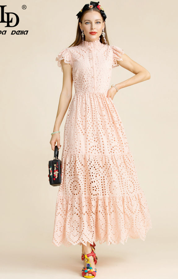 Summer Long Dress Women’s Stand Collar Single-Breasted Hollow Out Vintage Party Dress Vestidos