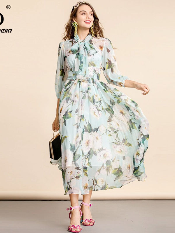 Summer Long Floral Vacation Dress Women Elegant Bow Lantern Sleeve Print Bohemian A-Line Beach Chiffon Dress