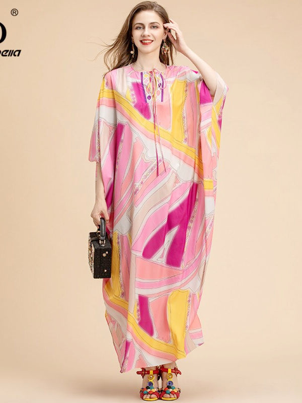 Summer Loose Long Dress Women Batwing Sleeve Printed Elegant Chiffon Maxi Dress Robe Gown