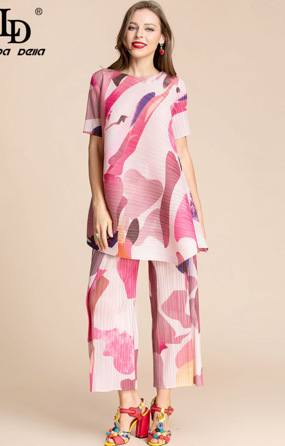 Summer Pants Suit Women’s O-Neck Short Sleeve Loose Long Top And Wide Leg Pants Two Pieces Set