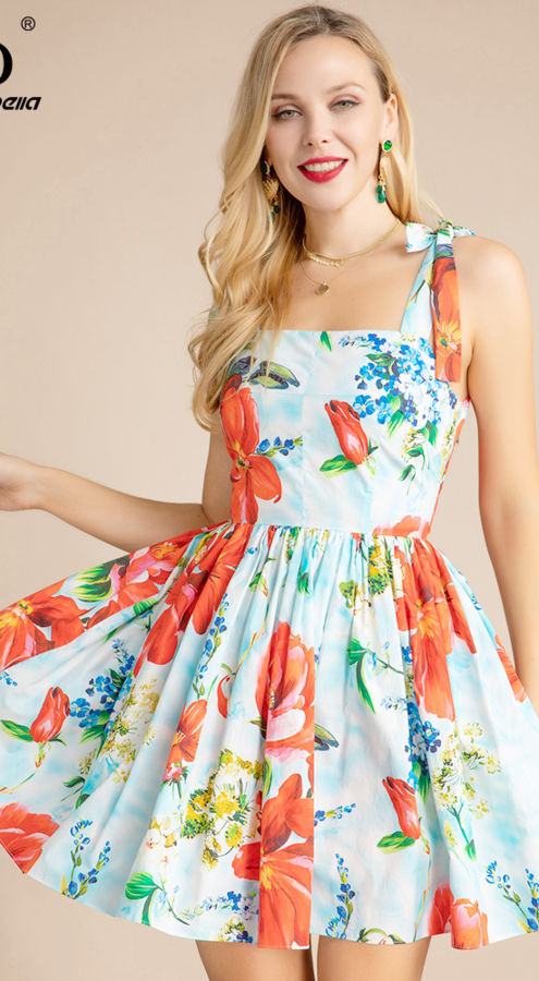 Summer Runway Fashion Cotton Dress Women Spaghetti Strap Holiday Beach Flower Print Elegant Short Dress Vestidos