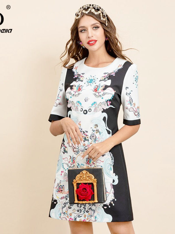 Summer Vintage Dress Women Short Sleeve Gorgeous Floral Print Beading Elegant Mini Dress
