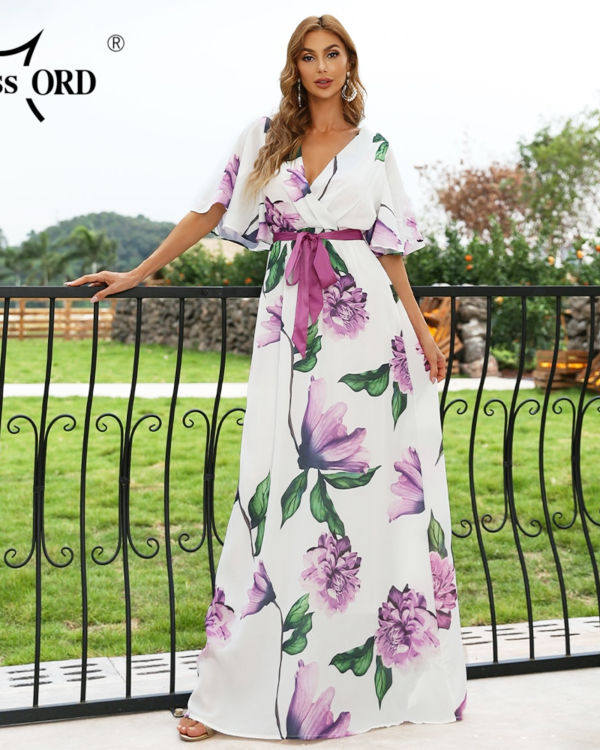 Summer Women V Neck Floral Long Dress Print Beach Boho White Self Belted Flower Maxi Dresses Vacation Causal